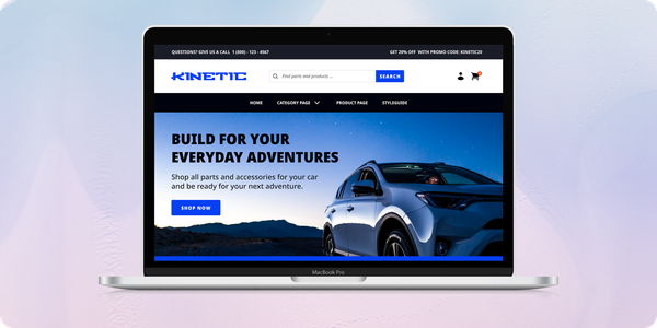 The Kinetic theme offers an edgier design that combines the large photos from the Circuit theme with the robust content offerings and product organization from the Max theme.