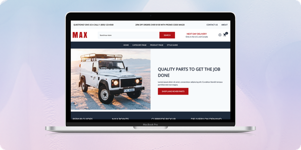 Volusion's Max theme uses a different hero image from the Circuit theme, giving you the option to add more text at the top of the page. It also uses more images—but they are smaller to show more products on the home page. This theme is ideal for auto parts stores that want to organize numerous parts and display them cleanly.