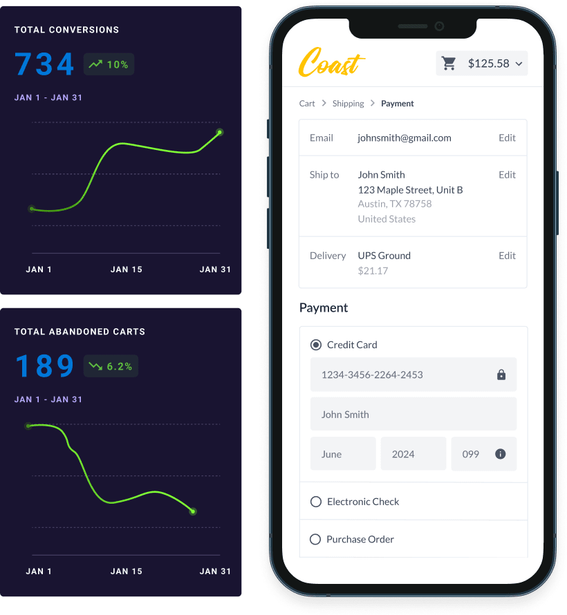 Our clean and modern-looking checkout flow was designed to elicit a professional appearance, encouraging more shoppers to convert into buyers.